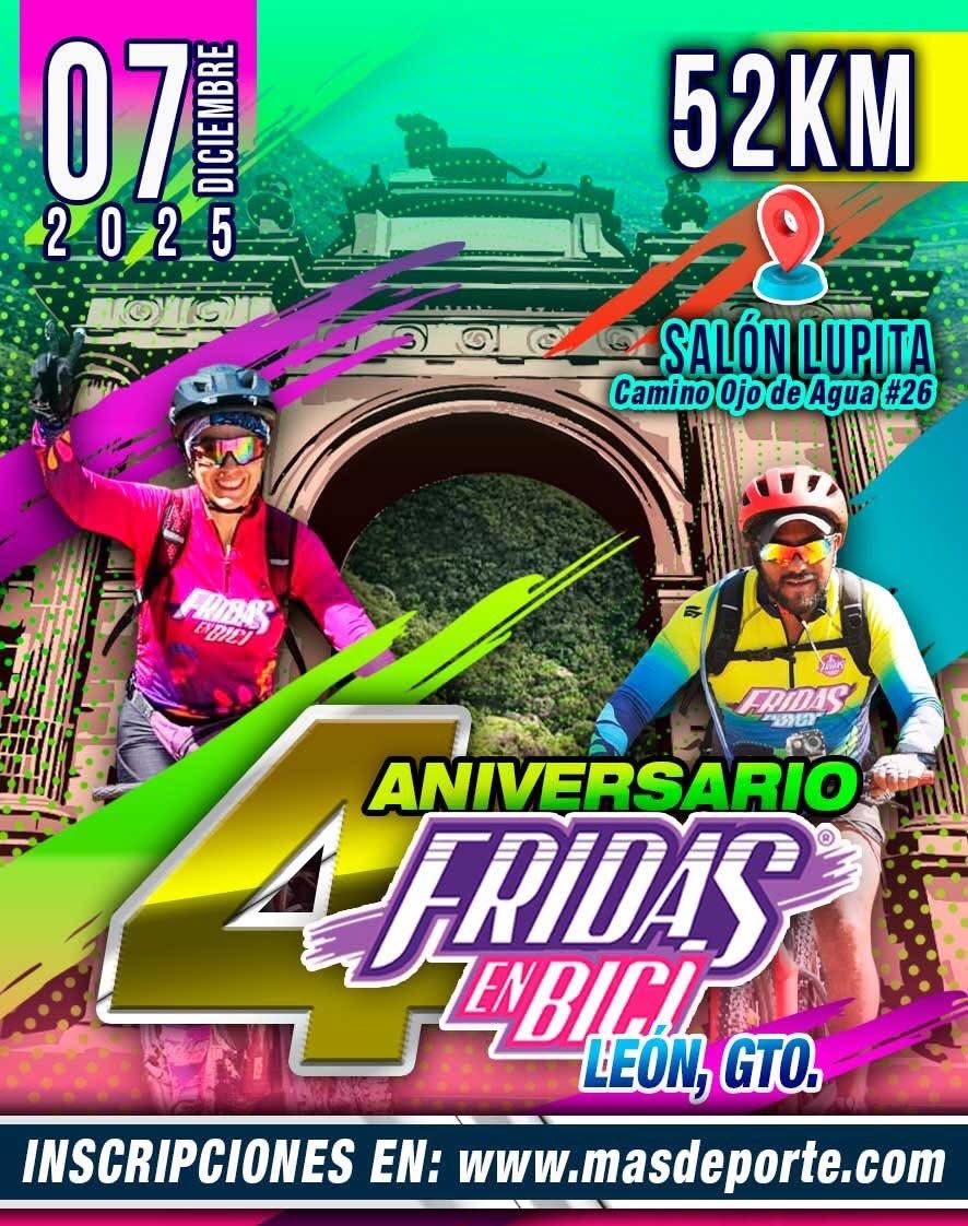 4° Aniversario Fridas en Bici LeónLa cita es en el Salón Lupita, Ojo de Agua, donde daremos inicio a una rodada que pondrá a prueba tu energía y te llenará de emoción.🤗🙌🏻🌄 Una ruta MTB retadora y divertida ✨⚡️💫💜 Convivencia ciclista única🎶…